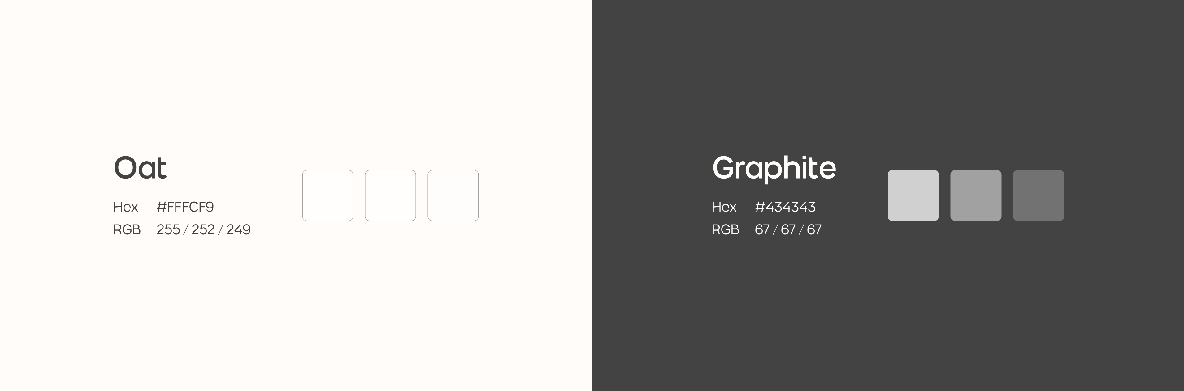 Oat and Graphite are intentionally understated so the merchandise takes center stage. In store and online, these neutrals create a calm frame that lets product color carry the visual energy. The palette supports legibility, contrast, and long‑term flexibility across packaging, signage, and the site.